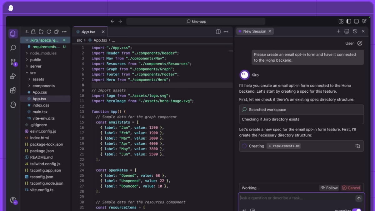 Kiro, GitHub Copilot जैसे AI टूल्स से अलग है। यह Easy Approach to Requirements Syntax (EARS) फॉर्मेट के ज़रिए पहले स्पेसिफिकेशन (जैसे यूज़र स्टोरीज़, टेस्ट केस, डॉक्स) बनाता है और फिर कोड तैयार करता है।