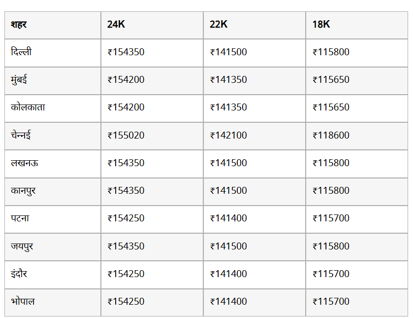 - दिल्ली: 24K – ₹1,54,350 | 22K – ₹1,41,500 | 18K – ₹1,15,800