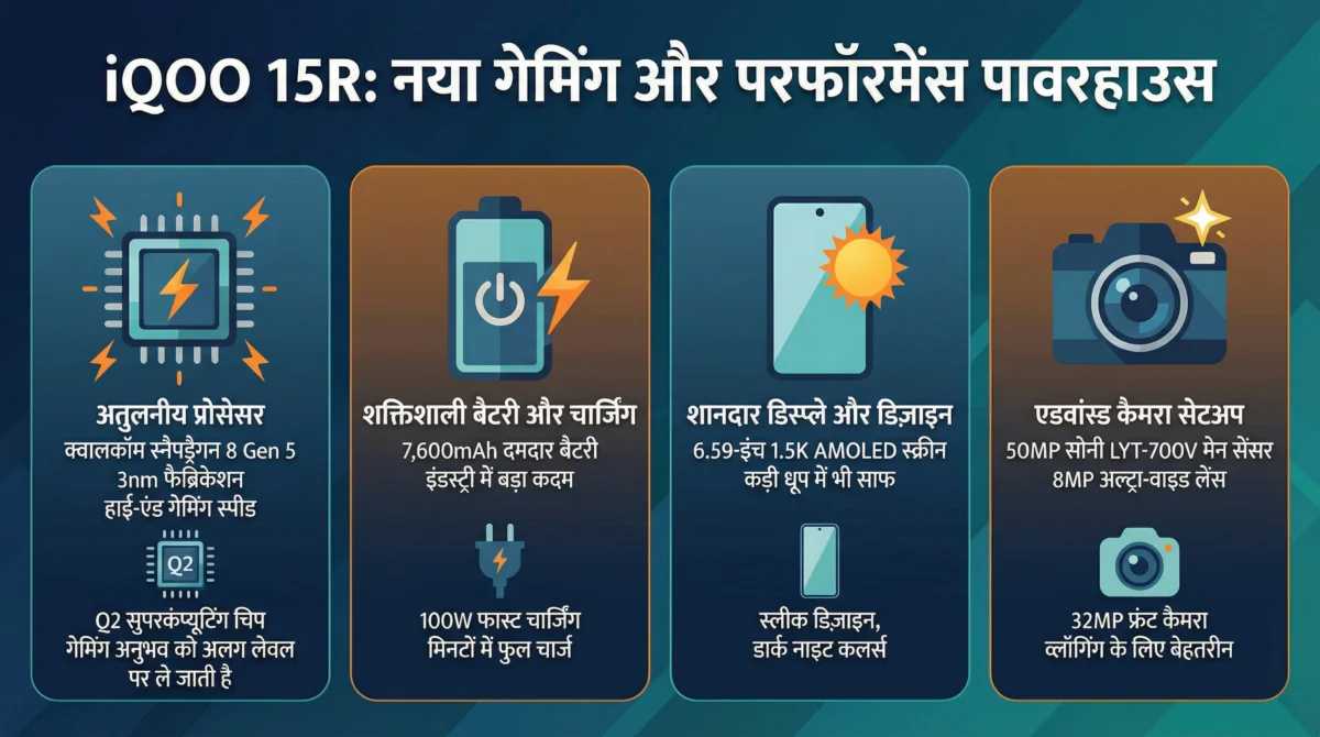 iQOO 15R भारत में लॉन्च हो गया है — यह कंपनी का नया मिड‑रेंज से फ्लैगशिप‑किलर स्मार्टफोन माना जा रहा है, जिसमें प्रीमियम हार्डवेयर और भारी बैटरी बैक‑अप मिलता है। नीचे जानिए कीमत, स्पेसिफिकेशन्स और उपलब्धता के बारे में सब कुछ एक ही जगह।