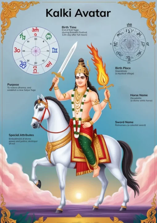 - पुराणों (विशेषकर भागवत पुराण, विष्णु पुराण, अग्नि पुराण) में लिखा है कि जब कलियुग अपने चरम पर पहुँच जाएगा और धर्म का पतन होगा, तब भगवान विष्णु कल्कि रूप में प्रकट होंगे।