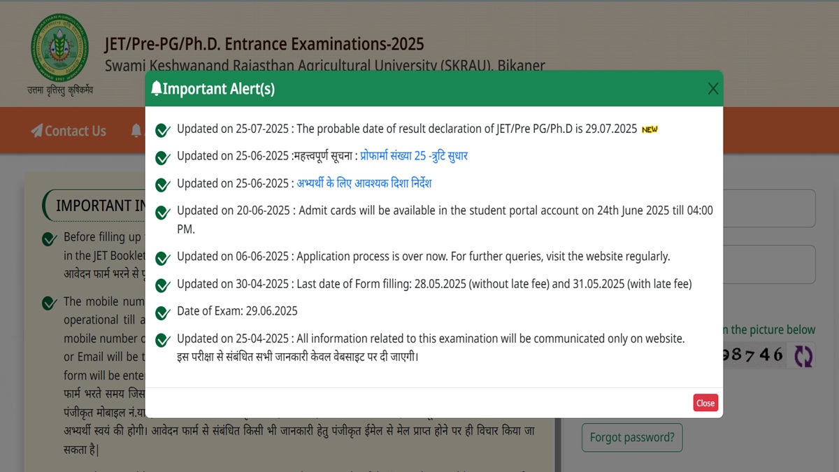 - Swami Keshwanand Rajasthan Agricultural University (SKRAU) ने Rajasthan JET 2025 (JET/Pre‑PG/Ph.D.) का परिणाम आज 29 जुलाई 2025 को आधिकारिक वेबसाइट jetskrau2025.com पर जारी किया