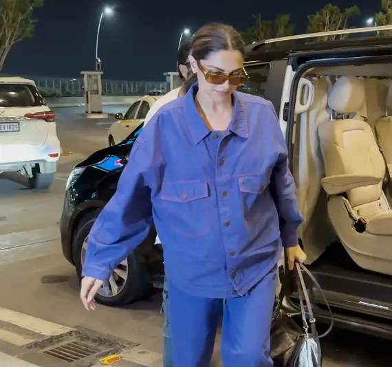 - Deepika Padukone ने oversized blue shirt और matching pants पहनी
