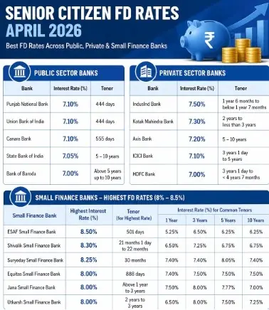 अप्रैल 2026 में सीनियर सिटिज़न्स के लिए FD रेट्स काफी आकर्षक स्तर पर हैं, जहां बड़े बैंक 7% के आसपास और छोटे वित्त बैंक 8.5% तक रिटर्न दे रहे हैं।