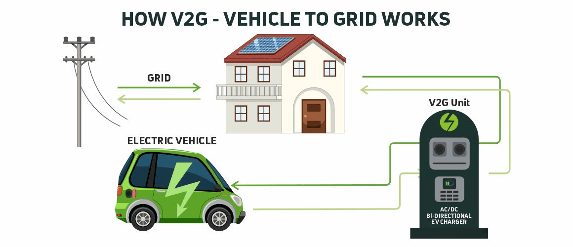 V2G का मतलब है Vehicle-to-Grid – जिसमें EV की बैटरी में स्टोर ऊर्जा को ग्रिड में वापस भेजा जा सकता है।